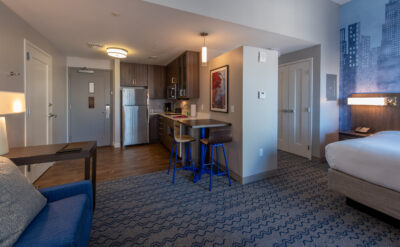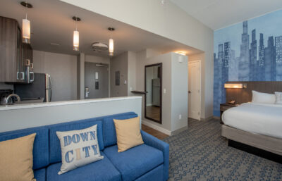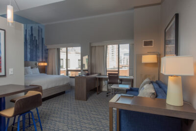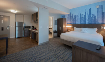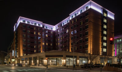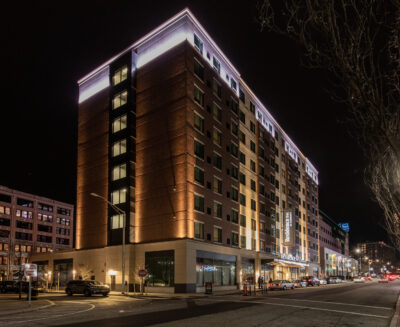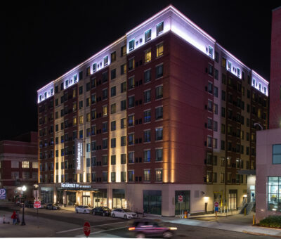 Vision 3 Architects, provided architectural services for the project’s planning, design development, and construction phases in collaboration with Group One Partners. The new Residence Inn hotel features a mix of guest rooms with studio type rooms for abbreviated stays and single bedroom guest rooms with kitchen and living areas for extended stays. The hotel accommodates 176 guest rooms over nine stories, and features an independent restaurant located on the first floor.