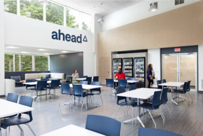 In collaboration with Sheehan’s Office Interiors, Vision 3 curated flexible furniture solution to maximize flexibility with the cafeteria. From daily dining to corporate town halls, the space is well-positioned to adapt to serve Ahead’s colleagues into the future.