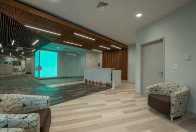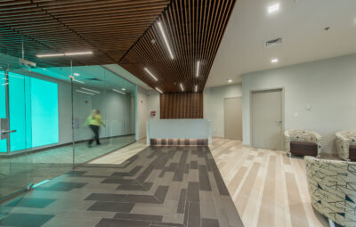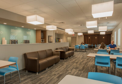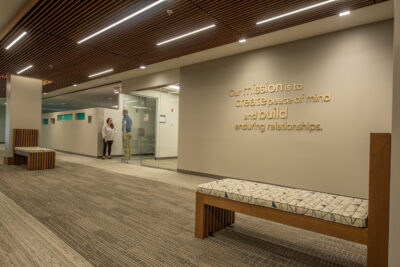 Amica Insurance, a Rhode Island-based mutual insurance company, purchased an existing one-story, 34,000 s.f. former bank operations and data center, which they gutted in anticipation of renovating the building into a new 24-hour customer service call center. The existing building was extensively renovated on both the exterior and interior. For security reasons the original building had minimal windows; original windows were replaced, and new ones added to double the amount of windows, allowing natural light into most areas of the building. Additional exterior renovations included a new roof and sloped roof entrance canopy. Amica’s corporate brand interior finishes were utilized, but design features were added to compliment the standard finishes, including walls with colored glass accents, custom millwork, and decorative wood ceilings. Site improvements included landscaping, outdoor dining patio, LED site lighting, and doubling the amount of parking spaces. The building also has a new full-building emergency generator, allowing operations to remain fully functional during power outages.