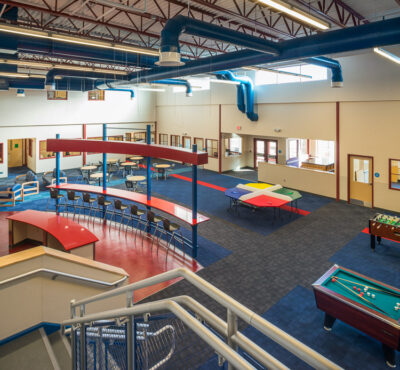 Vision 3 completed the master plan, design and construction of a 17,500 s.f. addition to the Alfred Elson, Jr. Boys & Girls Club in Pawtucket. The new addition houses the Club’s Teen Center, which provides program and homework rooms, a full size gymnasium, fitness center, and games area. New administration offices are located in the upper level. A goal of the project was to promote safety by providing visual connections between most of the spaces, while creating separate spaces. The project included a major interior renovation of the 35,000 s.f. existing building and additional viewing area in the pool room, as well as renovations to the Arts program (dance, music, art), a commercial kitchen, and multi-purpose dining space. Work was completed while existing facility remained in operation and renderings were provided for fundraising efforts.