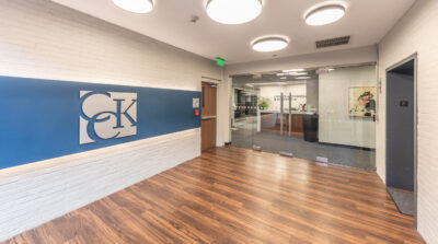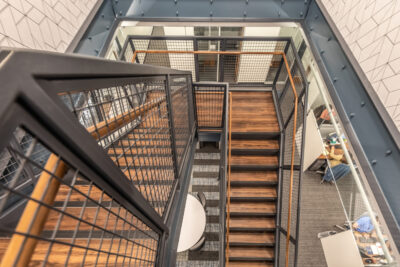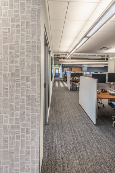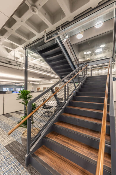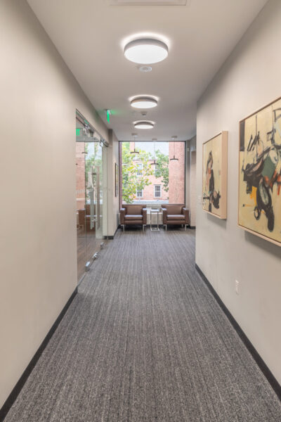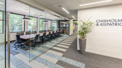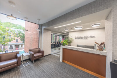 Vision 3 Architects completed an interior fit-out and renovation for the law offices of Chisholm, Chisholm and Kilpatrick in downtown Providence, RI. The interior renovation involved approximately 31,000 sf of tenant space and common area on the first, second and third floors of the building. CCK requested modern design touches with an open, contemporary feel to help them hire and retain young talent in a competitive legal job market. The open office concept features more workstations than traditional private offices in a departure from a traditional law firm layout, with collaborative spaces and huddle rooms to accommodate the need for private conversations and “heads down” work.