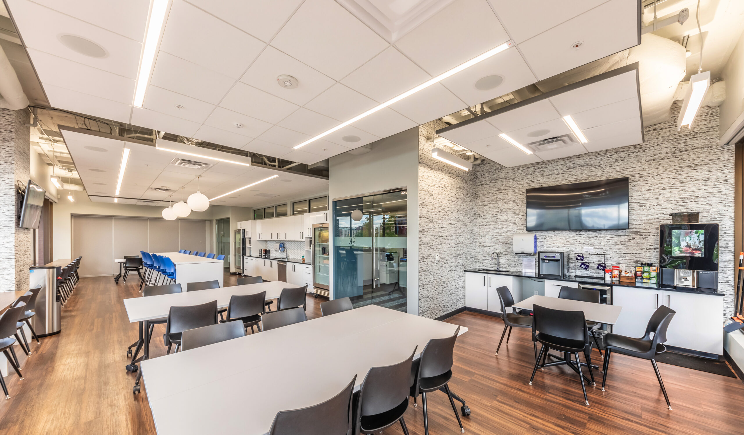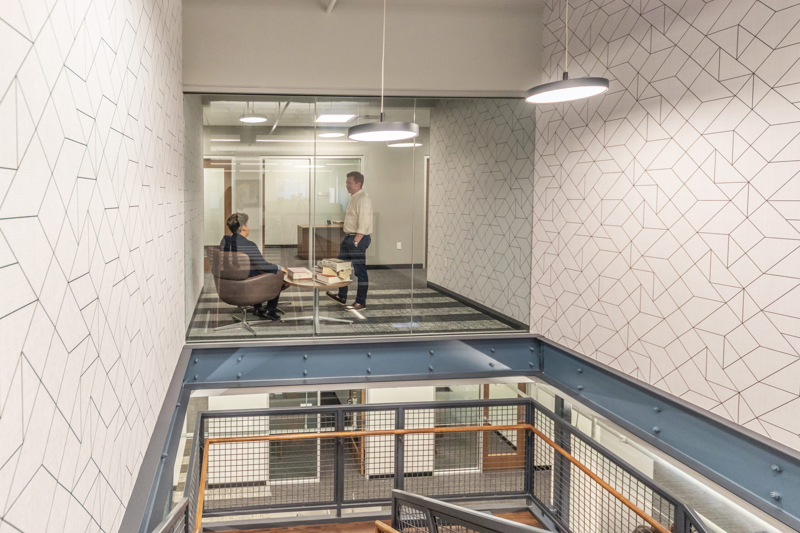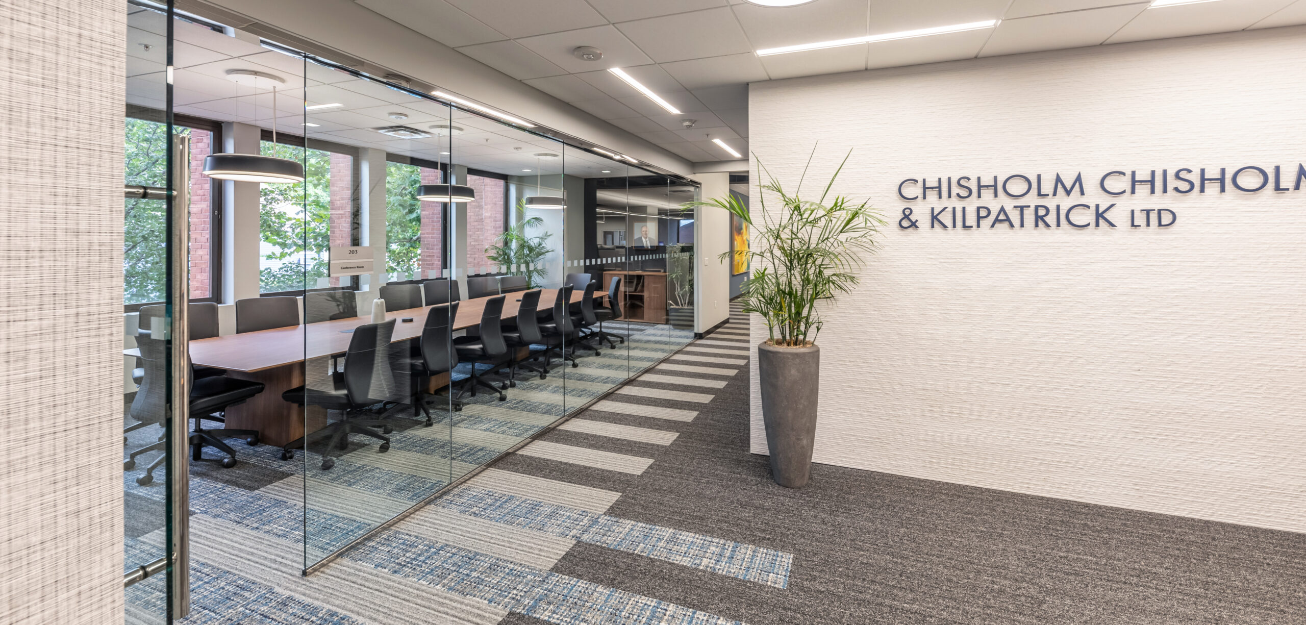 Vision 3 Architects completed an interior fit-out and renovation for the law offices of Chisholm, Chisholm and Kilpatrick in downtown Providence, RI. The interior renovation involved approximately 31,000 sf of tenant space and common area on the first, second and third floors of the building. CCK requested modern design touches with an open, contemporary feel to help them hire and retain young talent in a competitive legal job market. The open office concept features more workstations than traditional private offices in a departure from a traditional law firm layout, with collaborative spaces and huddle rooms to accommodate the need for private conversations and “heads down” work.