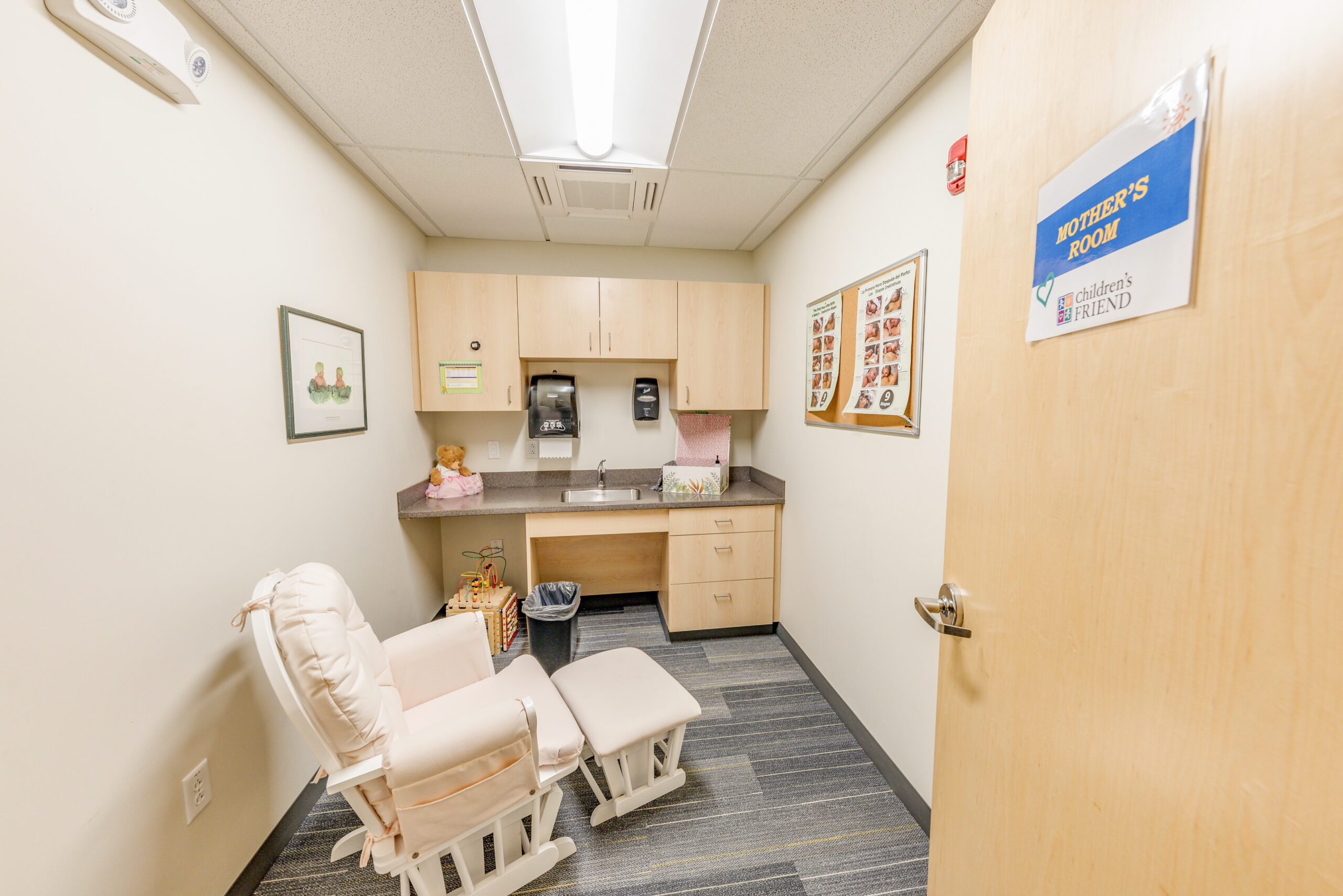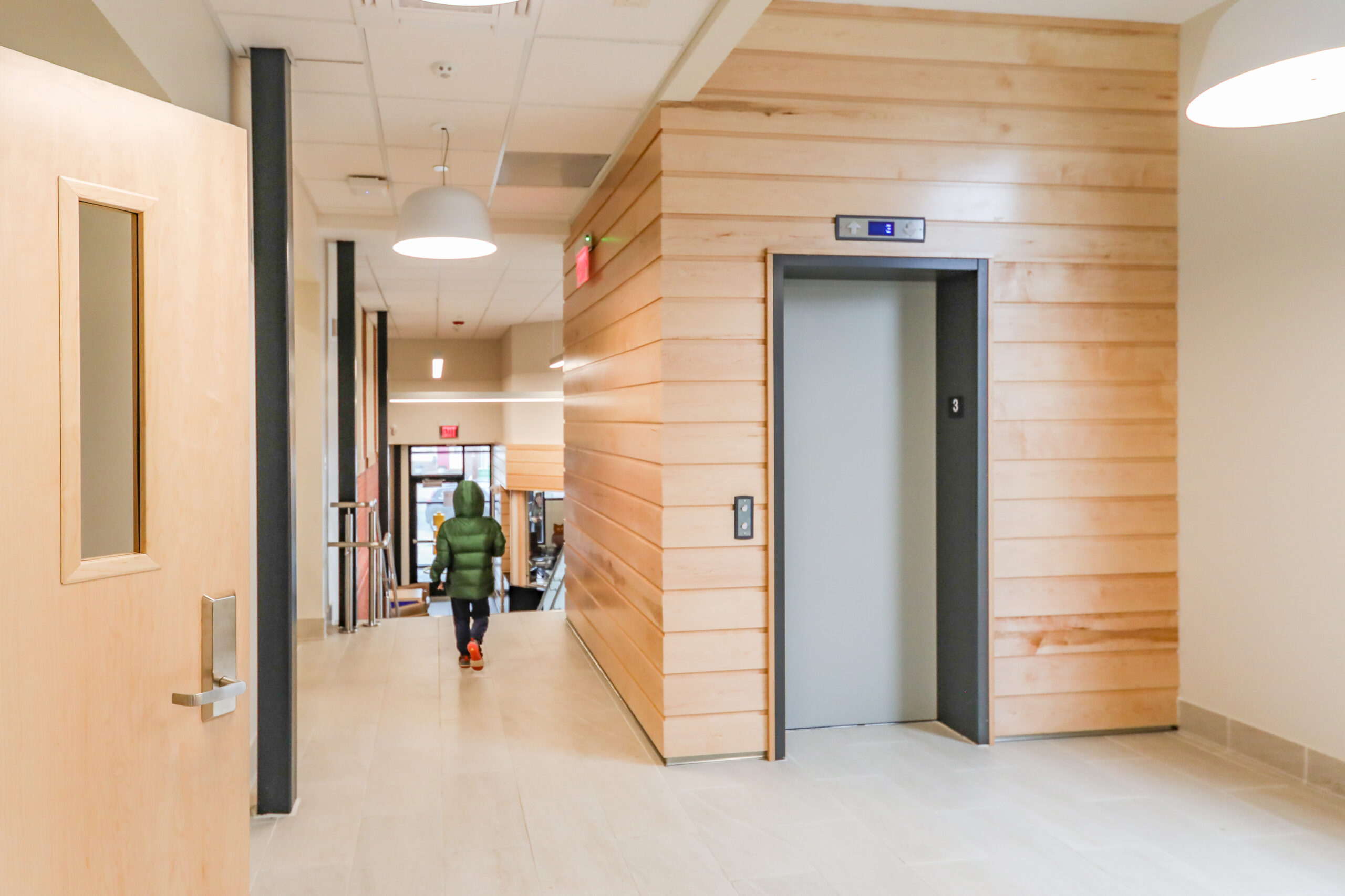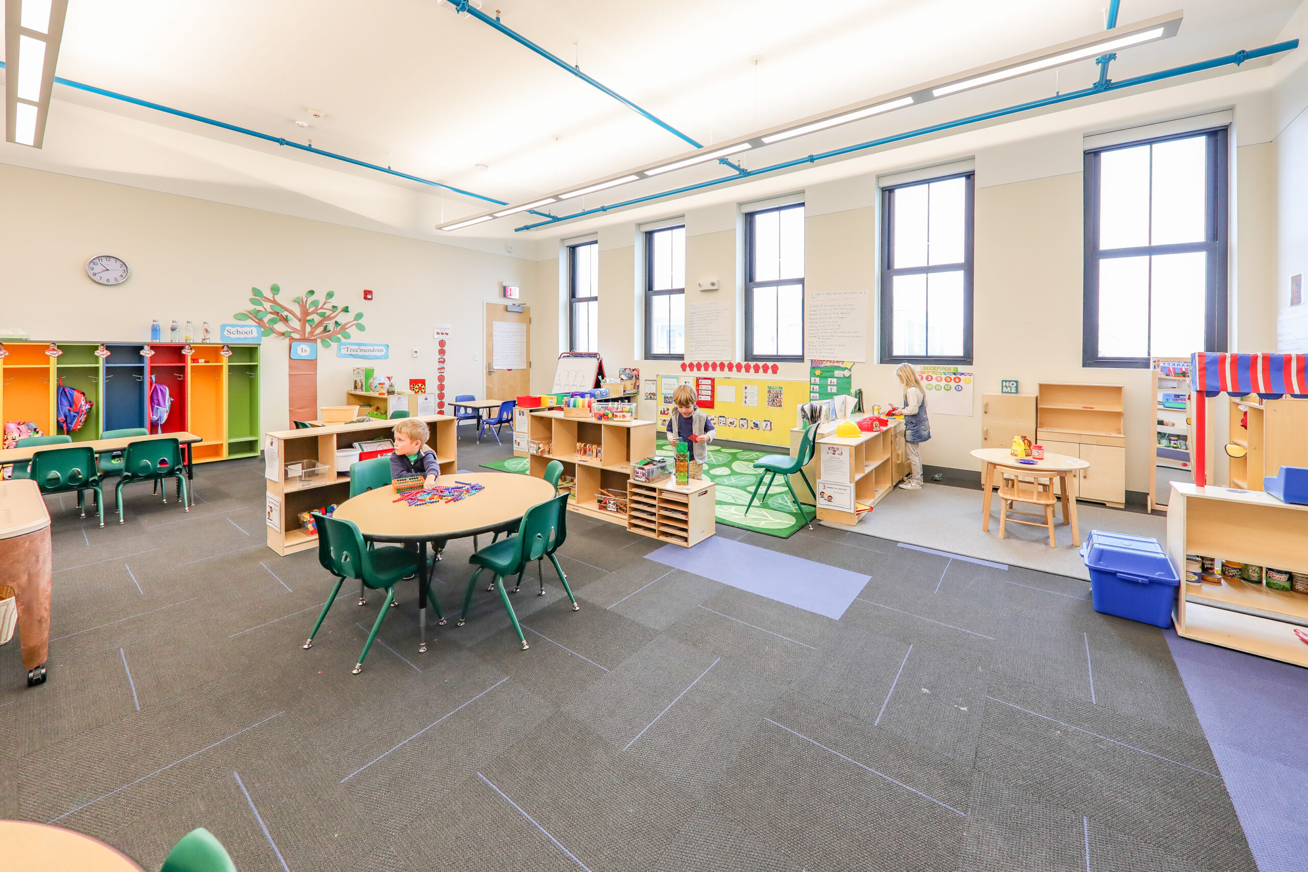 Additional improvements included replacement of all HVAC, electrical, plumbing and fire protection systems. The site improvements include new site utilities, new playground area, new fencing, site lighting, new walkways, new parking area, and new landscape areas. The facility incorporates multiple sustainable design features, including a high-performance energy efficient HVAC system that provides individual space climate control, low water consumption plumbing fixtures, hands-free automated faucets, low VOC emitting finishes, high U-value performance glazing and window systems, and a thermally improved building envelope exceeding energy code minimum requirements. The building also features the latest security and control access technology consisting of biometrics access to provide security control to and from the daycare spaces.