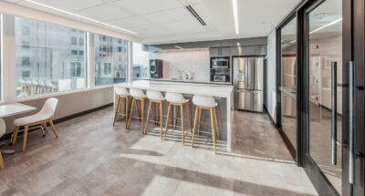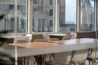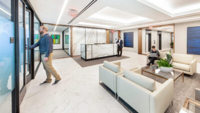 The high-end interior office fit-out for this well-established investment firm consists of the renovation of an entire 25,000 square foot floor, situated in a high-rise building with sweeping views of downtown Providence and beyond. The renovation includes collaborative spaces, open office work areas, private offices, a café with lounge area and e coffee bar. Key design features include a customized marble and steel reception desk with a staggering marble-walled backdrop, floor-to-ceiling walnut frames that house sleek steel shelving structures throughout, a custom boardroom credenza with waterfall marble edges, coffered acoustic ceilings, and hundreds of feet of continuous linear recessed lighting wrapping around the entire floor.