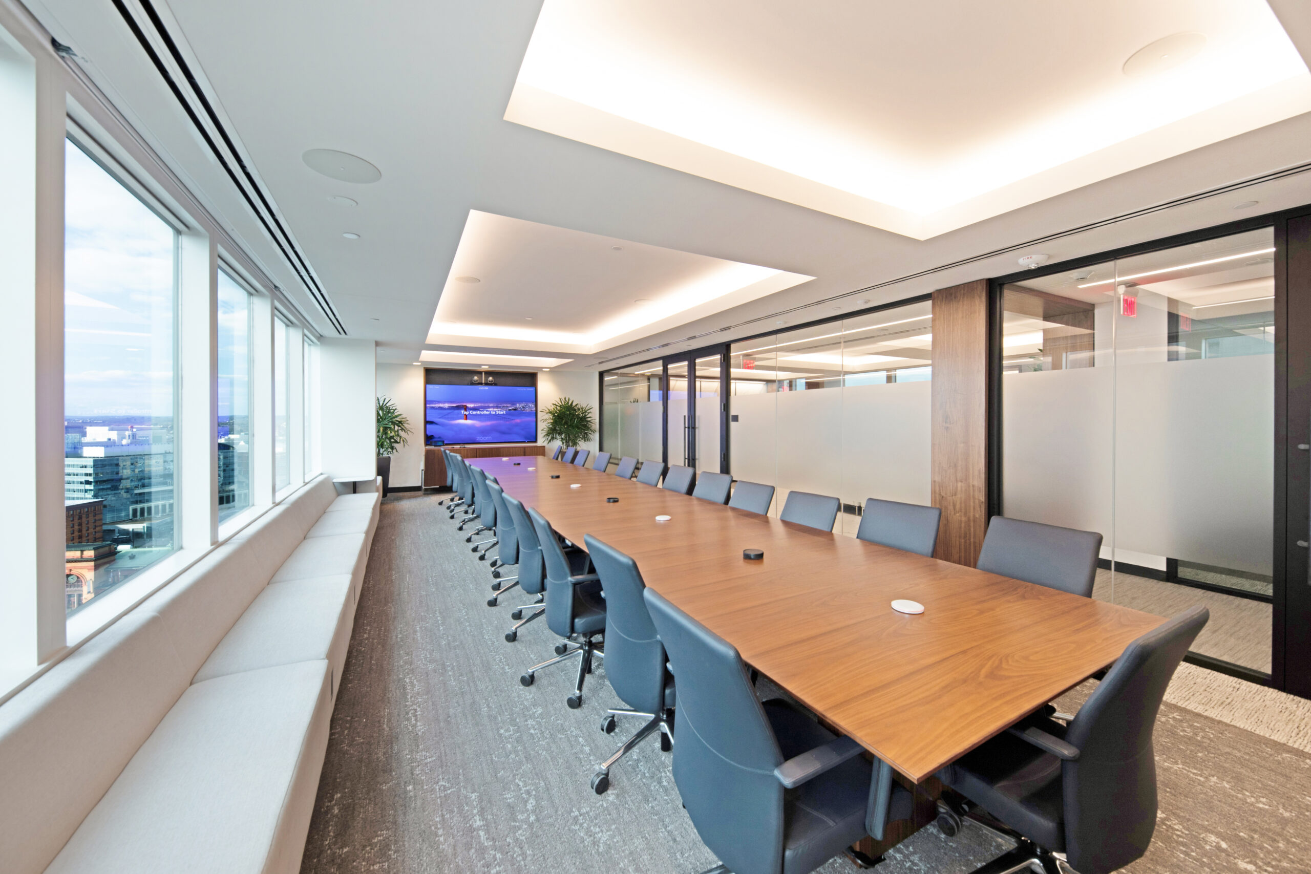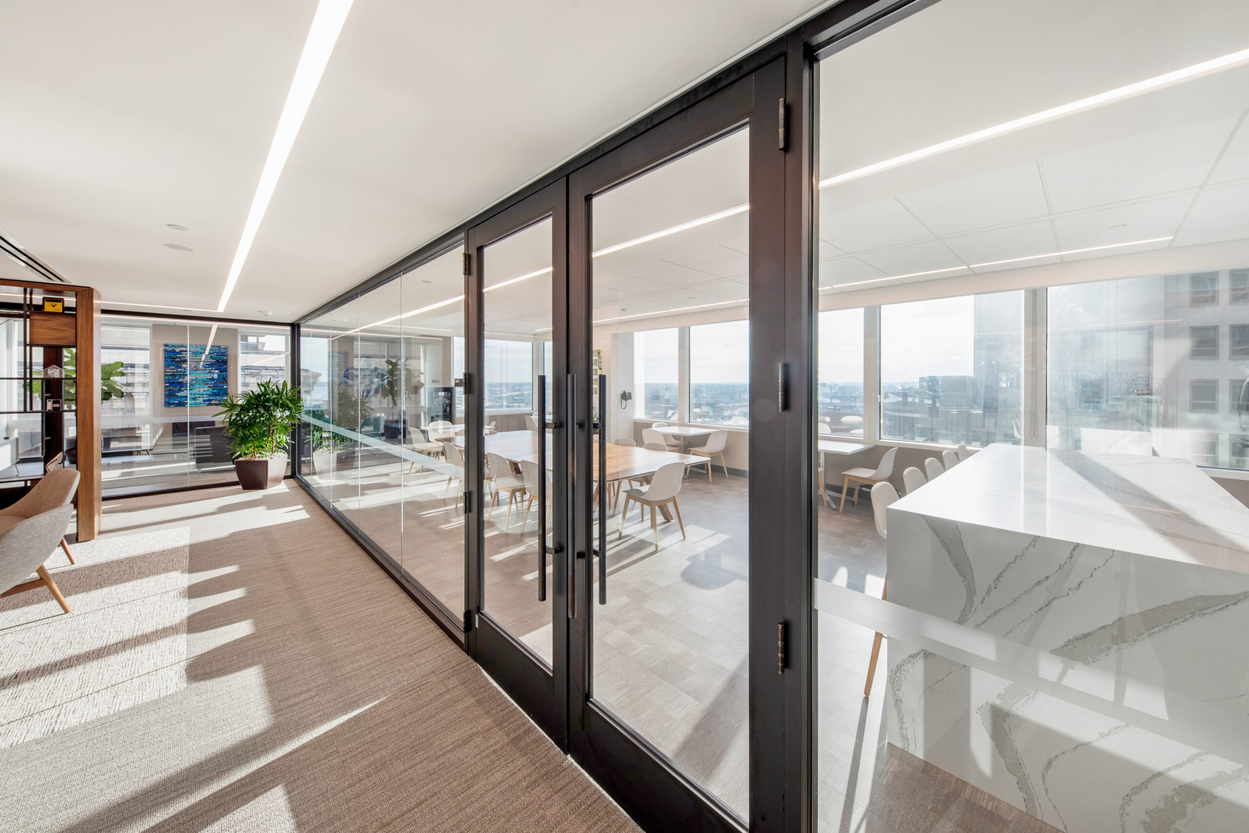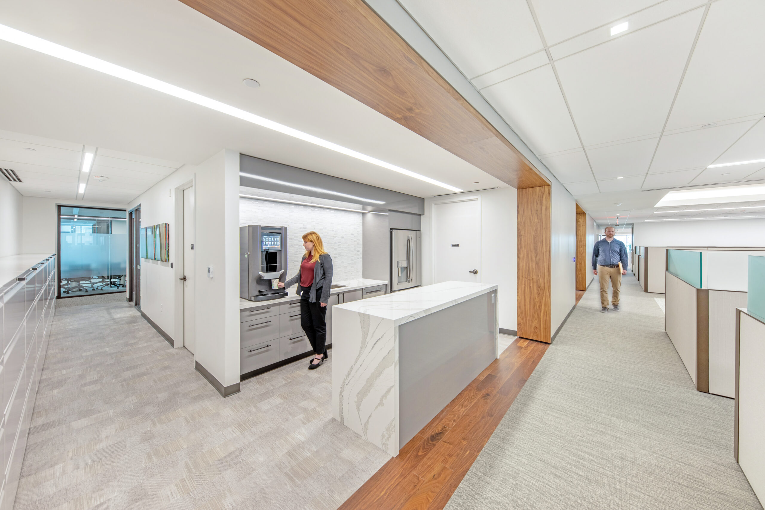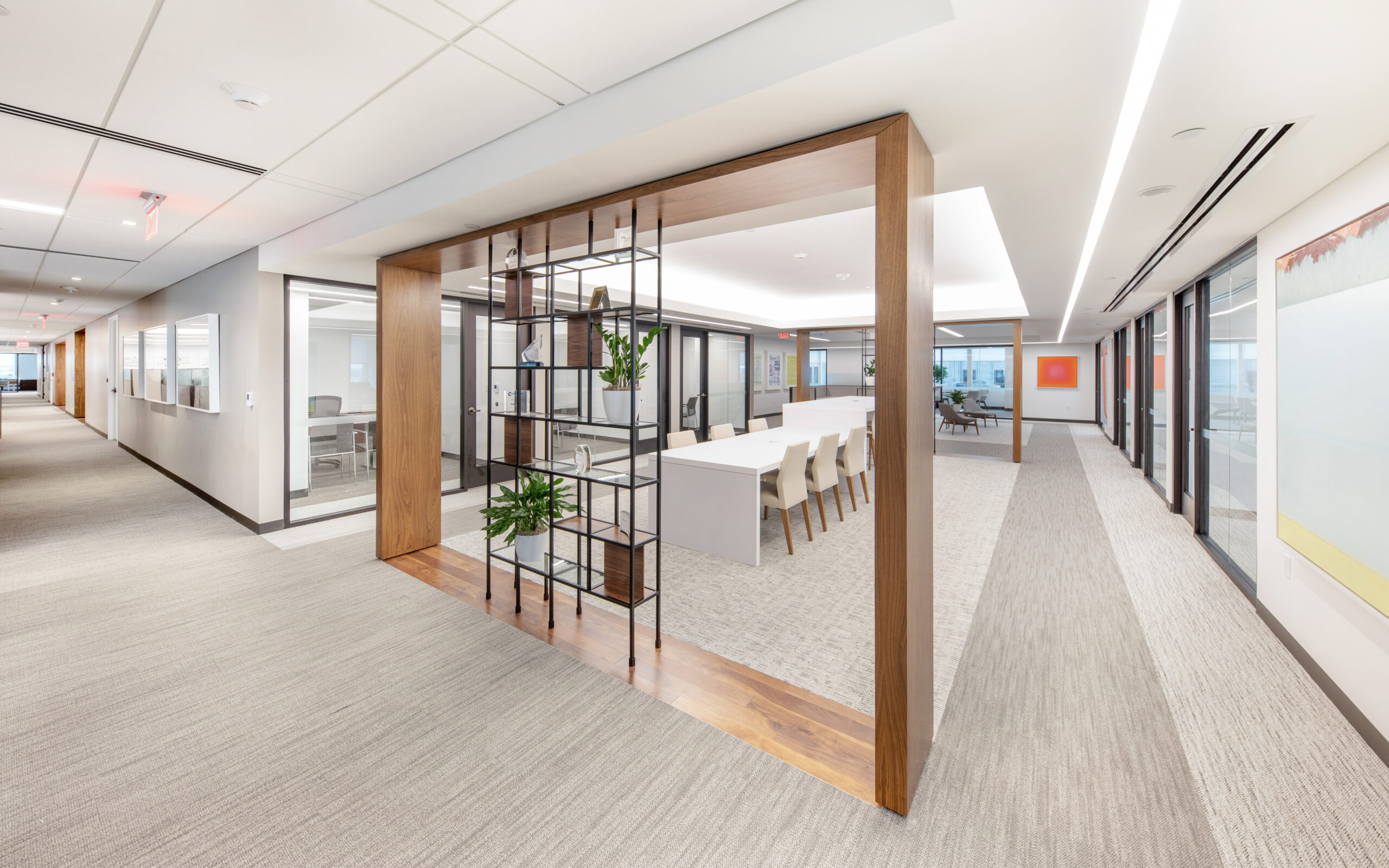 The high-end interior office fit-out for this well-established investment firm consists of the renovation of an entire 25,000 square foot floor, situated in a high-rise building with sweeping views of downtown Providence and beyond. The renovation includes collaborative spaces, open office work areas, private offices, a café with lounge area and e coffee bar. Key design features include a customized marble and steel reception desk with a staggering marble-walled backdrop, floor-to-ceiling walnut frames that house sleek steel shelving structures throughout, a custom boardroom credenza with waterfall marble edges, coffered acoustic ceilings, and hundreds of feet of continuous linear recessed lighting wrapping around the entire floor.