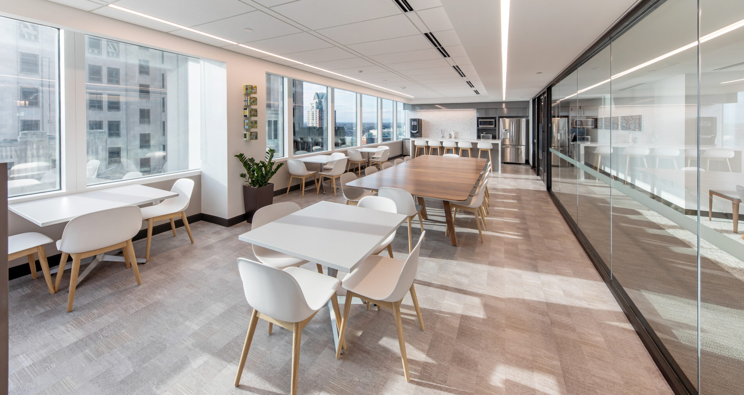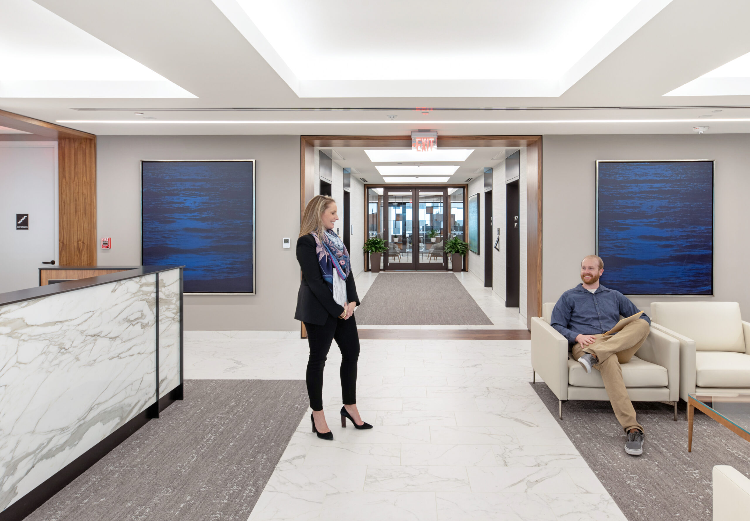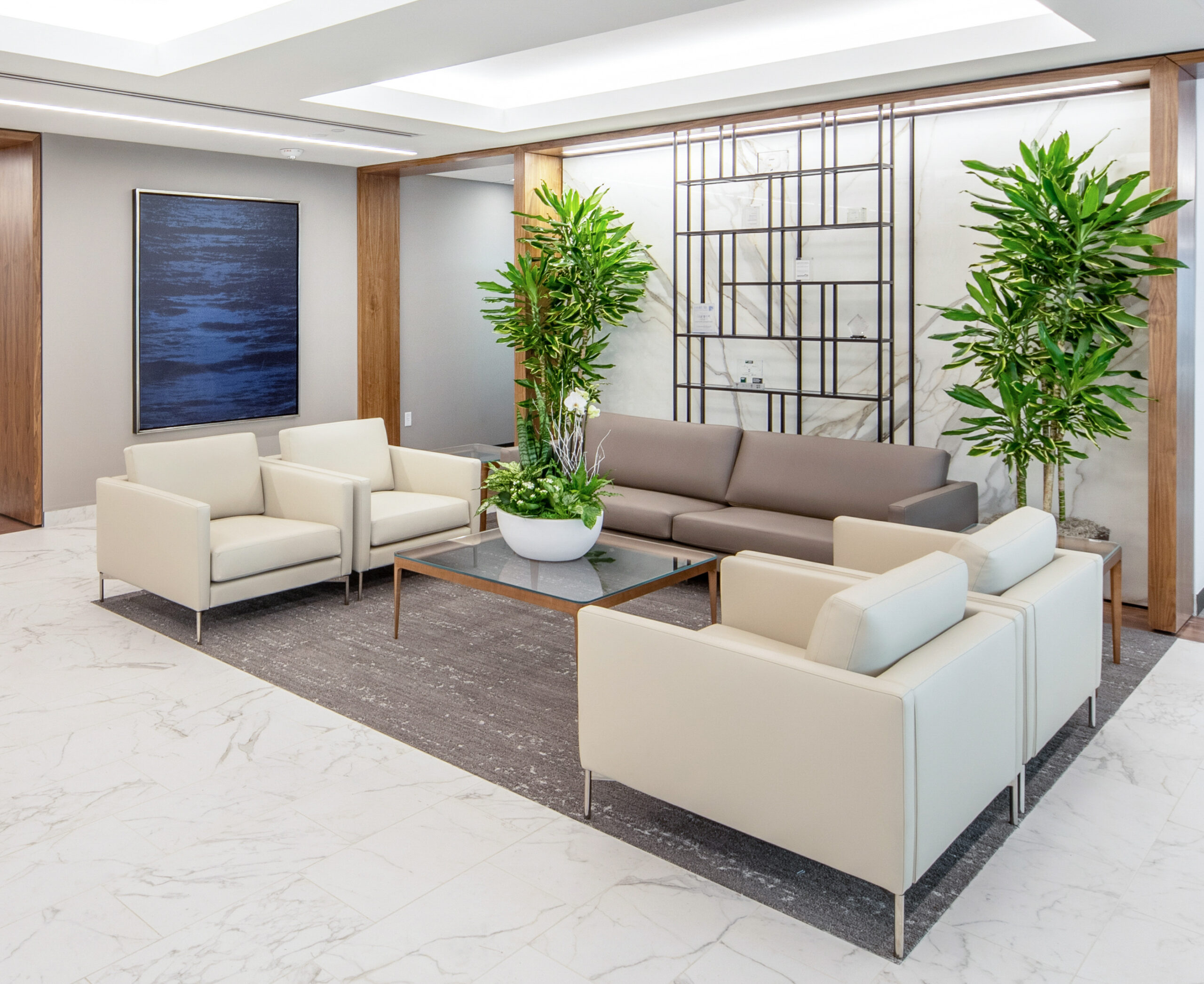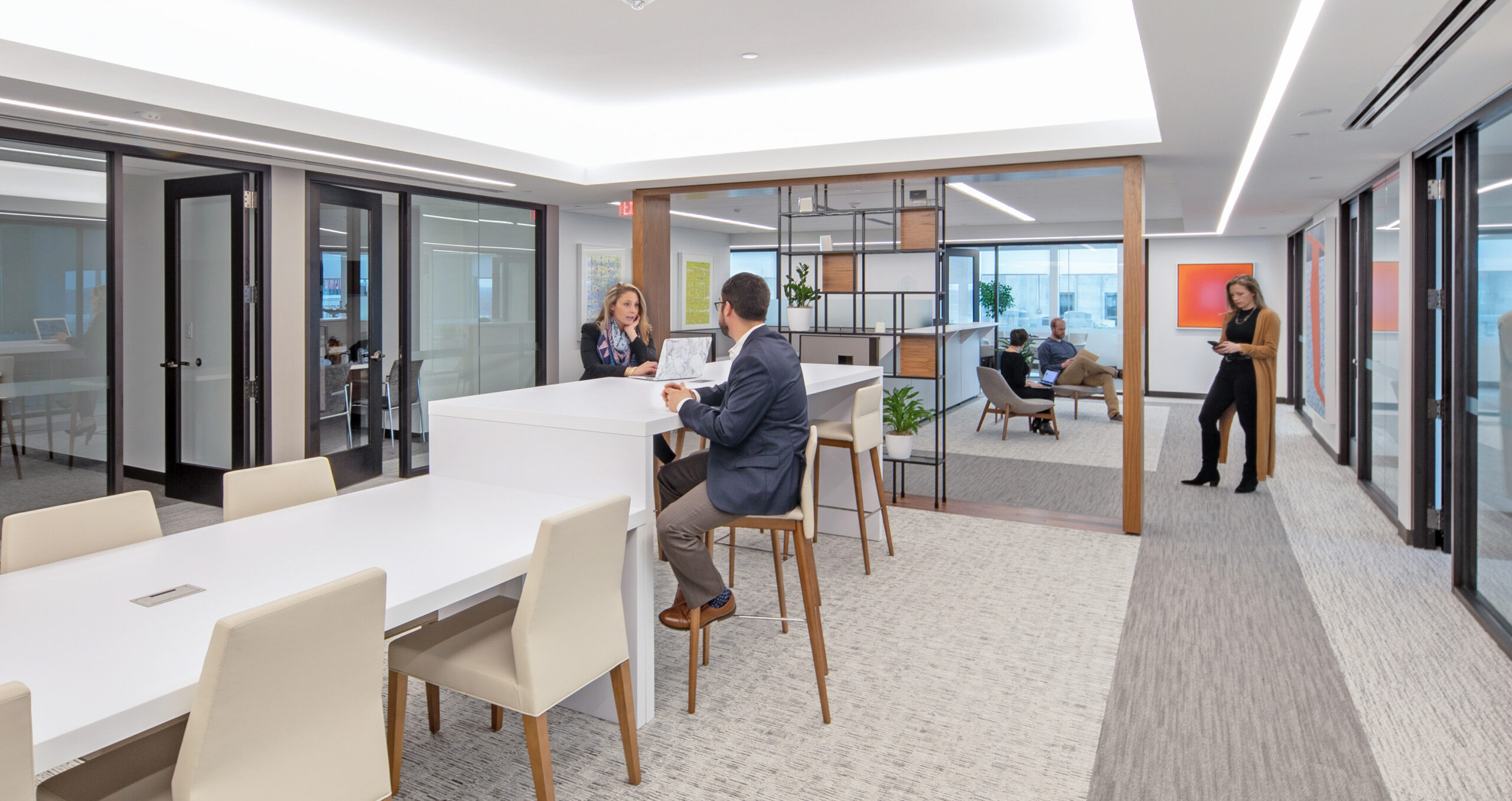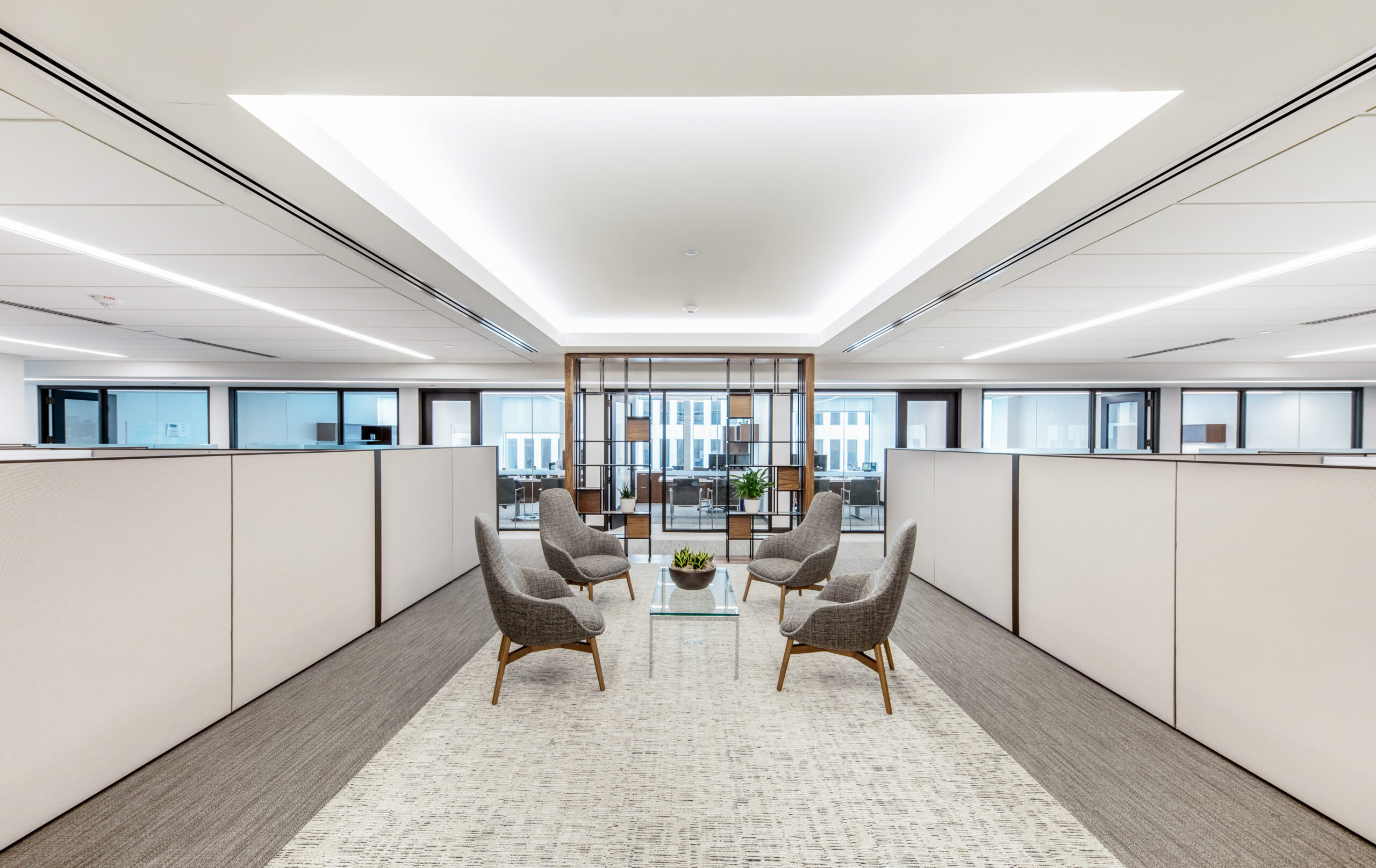 The high-end interior office fit-out for this well-established investment firm consists of the renovation of an entire 25,000 square foot floor, situated in a high-rise building with sweeping views of downtown Providence and beyond. The renovation includes collaborative spaces, open office work areas, private offices, a café with lounge area and e coffee bar. Key design features include a customized marble and steel reception desk with a staggering marble-walled backdrop, floor-to-ceiling walnut frames that house sleek steel shelving structures throughout, a custom boardroom credenza with waterfall marble edges, coffered acoustic ceilings, and hundreds of feet of continuous linear recessed lighting wrapping around the entire floor.