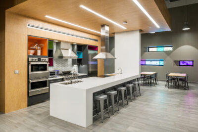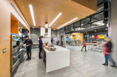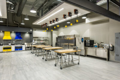 Vision 3 Architects worked with Johnson & Wales University Providence, one of the world’s leading educators of culinary arts on a new 3,700 s.f. culinary academic and lab space. The project involved the renovation and adaptive re-use of 2,150 s.f. book storage space and 1,550 s.f. open space within an existing culinary museum. The new space now includes conceptualization, tasting, marketing, ideation areas, and food science and culinary lab kitchens. Extensive modifications were made to the existing fire protection systems to accommodate the new culinary use, new electrical and plumbing systems to support the kitchen lab equipment, new lighting, updating the HVAC system to support the heating and cooling requirements, and a new kitchen exhaust and make-up air systems. Additionally, new windows were installed to allow for natural light to filter into this vibrant space, and new modern interior finishes throughout.