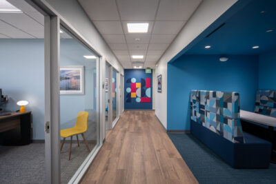 Our team provided comprehensive architectural, interior design, and construction phase services, coordinating all phases from our home office in Providence, Rhode Island. We conducted periodic site visits to Michigan throughout construction, ensuring seamless project management and quality control. The result is a dynamic workspace tailored to MAIPF’s functional needs and aesthetic vision.