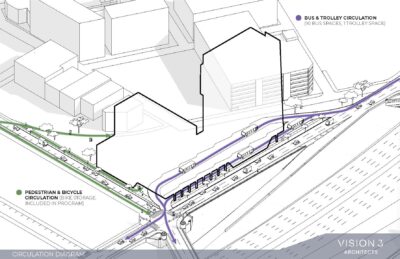 This design exercise investigated the potential redevelopment of two parcels within Providence’s Innovation and Design District in order to accommodate the relocation of the City’s bus hub from Kennedy Plaza. The two sites, located on former route 195 land, combine to make a super-block – allowing tremendous flexibility to integrate a variety of uses into a single location; the building’s proposed program includes the relocated bus hub, ground-floor retail, flexible workspace, social services, a restaurant and conference center, and market-rate apartments.