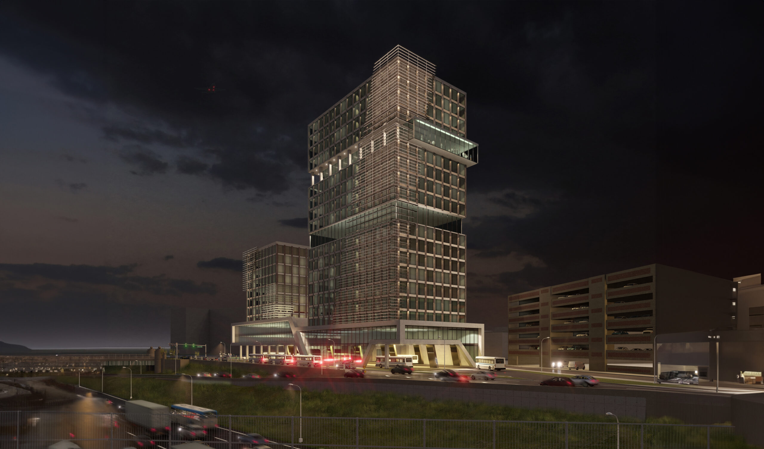 Surrounded by green space set aside for recreational activities, the ground level is ‘carved out’ to provide shelter for bus pick-up and drop-off – creating a podium above to enable the building’s many uses. Upper floors accommodate the majority of the residential program, such as affordable housing for nurses and teachers, while the larger consists of traditional apartments. The restaurant and conference center also sit within the larger tower, rising above the cityscape to capture views of Narragansett Bay to the south. The building façade is treated with louvered fins, which are positioned according to the direction of the sun and allow the development to glow at night.