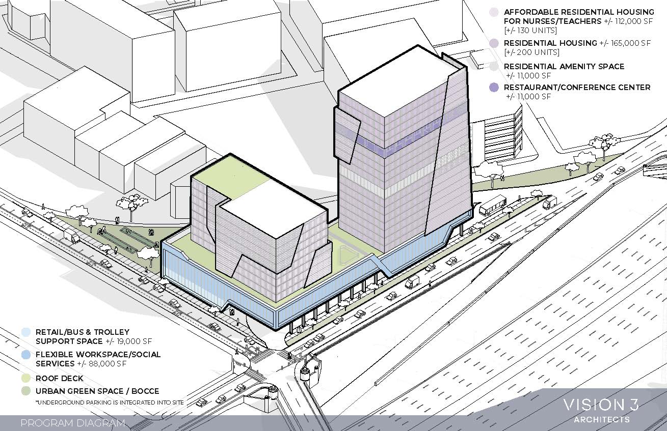 This design exercise investigated the potential redevelopment of two parcels within Providence’s Innovation and Design District in order to accommodate the relocation of the City’s bus hub from Kennedy Plaza. The two sites, located on former route 195 land, combine to make a super-block – allowing tremendous flexibility to integrate a variety of uses into a single location; the building’s proposed program includes the relocated bus hub, ground-floor retail, flexible workspace, social services, a restaurant and conference center, and market-rate apartments.