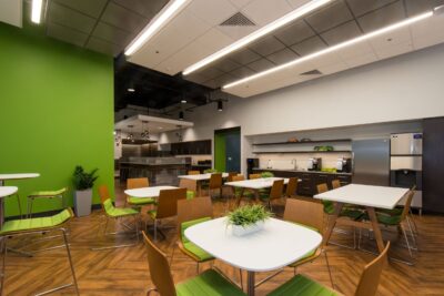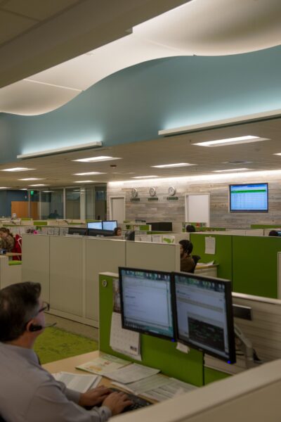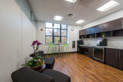 Sustainable Design efforts include the exclusive use of LED lighting, low-flow sensored plumbing fixtures, and the use of reclaimed weathered redwood wall accents, which becomes a common theme used throughout the space. Biophilic design was introduced throughout the project to bridge a relationship between the individuals and their environment. A direct connection to nature was achieved by maximizing employees’ exposure to natural light through space layout design. An indirect connection was achieved with careful consideration and selection of interior colors, patterns, and textures that feel natural and refreshing to staff members in their office environment. A “living wall” is located in the break room, and abundant live plants are scattered throughout the space, again providing staff with a figurative connection to outdoor space.