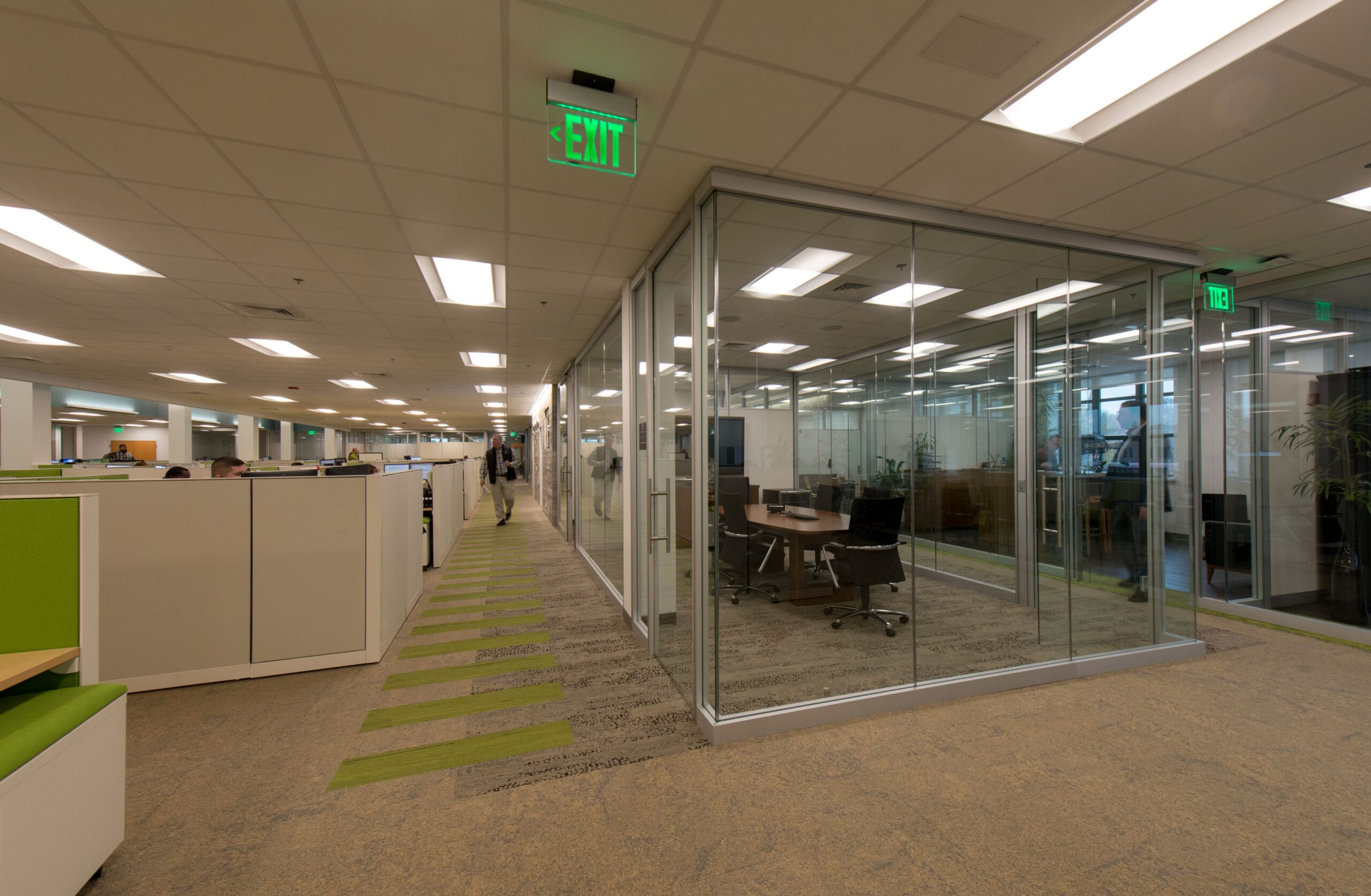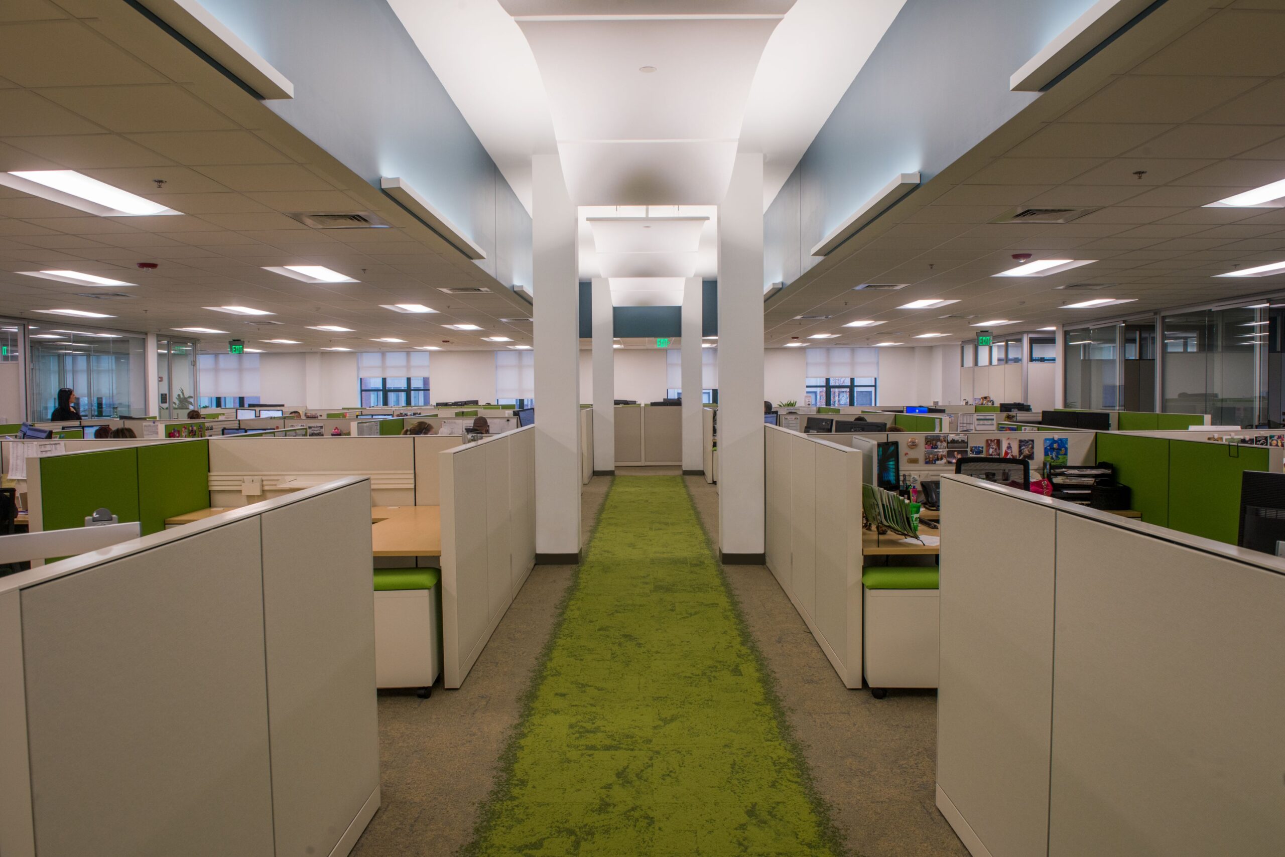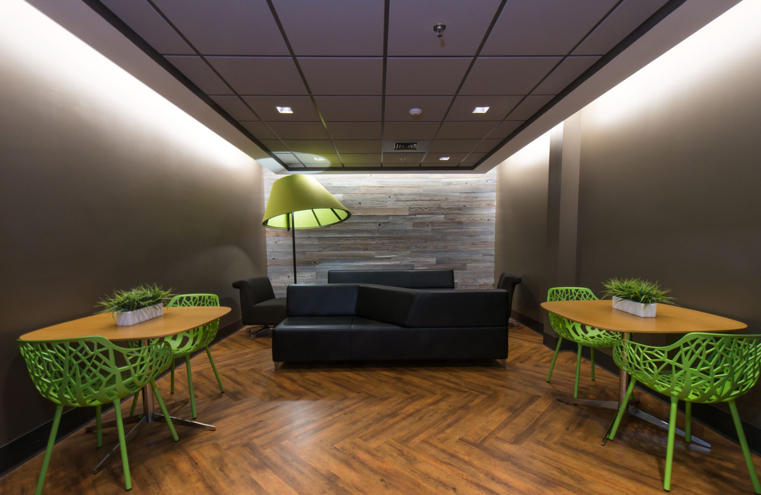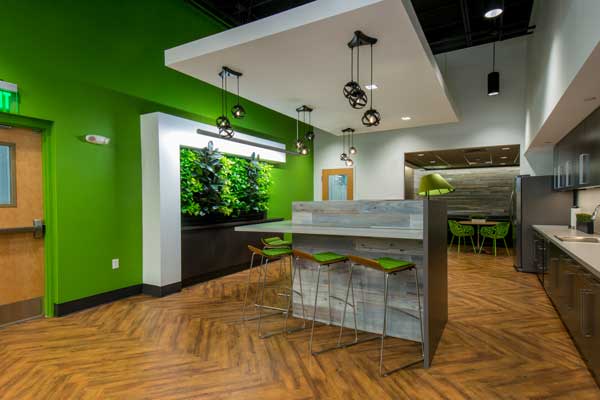 Sustainable Design efforts include the exclusive use of LED lighting, low-flow sensored plumbing fixtures, and the use of reclaimed weathered redwood wall accents, which becomes a common theme used throughout the space. Biophilic design was introduced throughout the project to bridge a relationship between the individuals and their environment. A direct connection to nature was achieved by maximizing employees’ exposure to natural light through space layout design. An indirect connection was achieved with careful consideration and selection of interior colors, patterns, and textures that feel natural and refreshing to staff members in their office environment. A “living wall” is located in the break room, and abundant live plants are scattered throughout the space, again providing staff with a figurative connection to outdoor space.