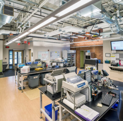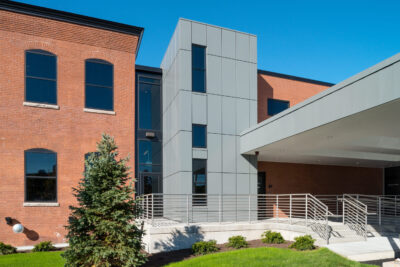 The design of the 23,000 s.f. lab building for Rhode Island Blood Center included renovations of a 2,600 s.f. existing historic building at 395 Promenade Street in Providence on property immediately adjacent to their existing headquarters. Similar to an assembly line, there is a complex procedure where blood product is brought into the building, tested, processed, stored, then distributed to local hospitals. The facility is a full-service regional blood center, providing testing, collections, marrow and cord blood programs, as well as in-hospital patient programs. The building is designed to meet National Grid’s Advanced Building’s Program. A key feature of the design is the clerestory which allows natural light into all habitable spaces of the building.