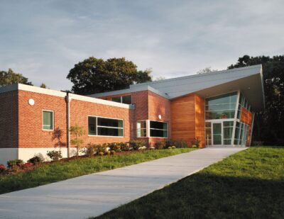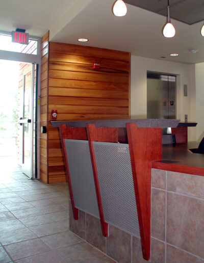Building 10 was the third former DCYF structure on the East Campus converted for use by the College. Designed to accommodate the growing needs of the Alumni Foundation, Publishing Services, and others, the plan includes an executive board room, offices, a call center and graphic design department. The entrance addition was concepted to form a strong link to previously completed renovations at Buildings 4 & 5 through its architectural form and use of custom-fabricated zinc paneling.