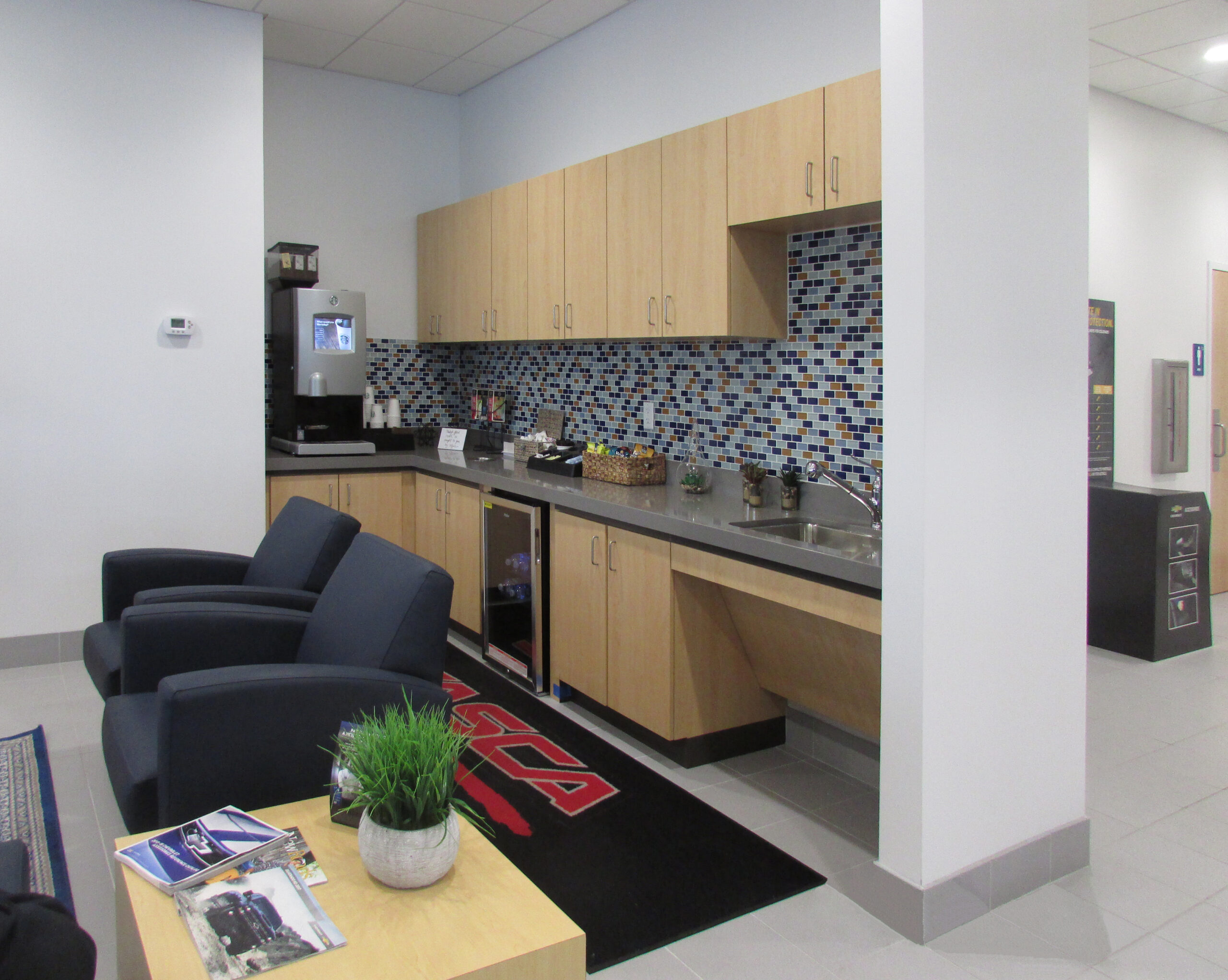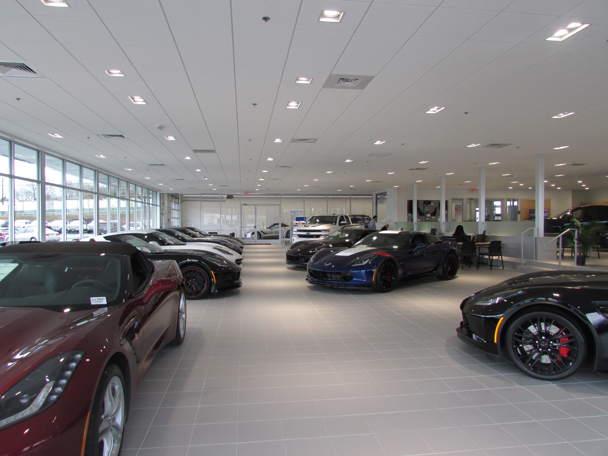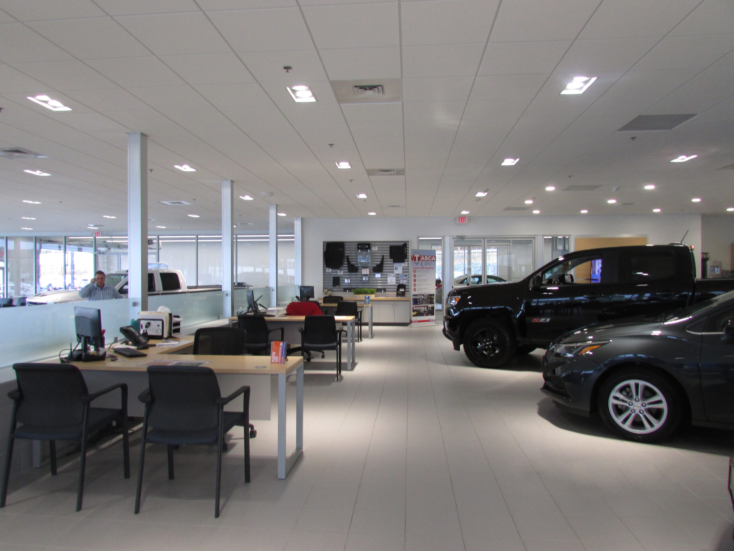 Exterior renovations included a new free standing entry tower, new glass storefront assemblies, new metal panel cladding, and new garage doors in the service drive. Interior renovations included floor plan alterations and finishes to the showroom, lounge, parts, service, restrooms, conference room, and sales office areas.