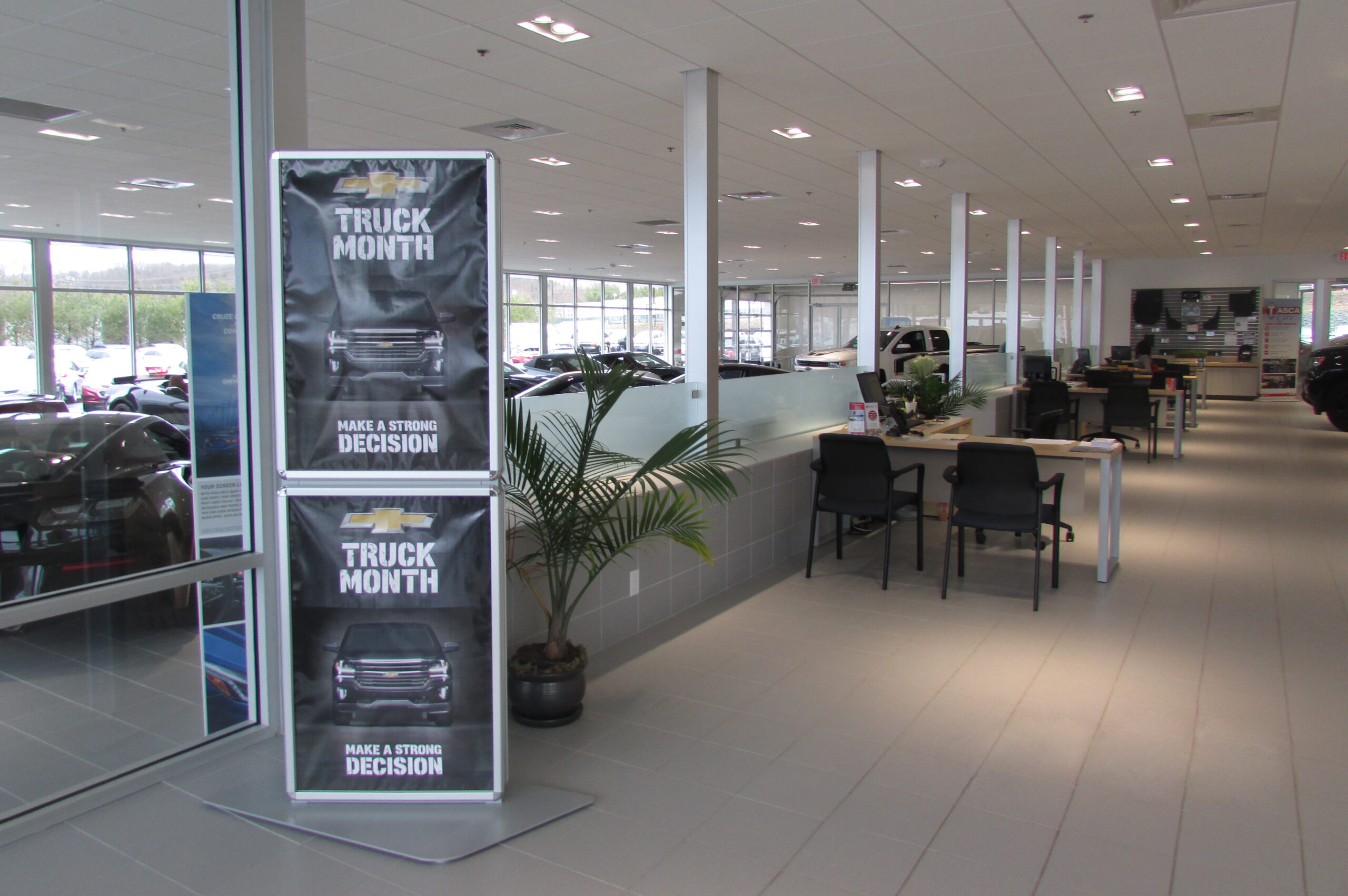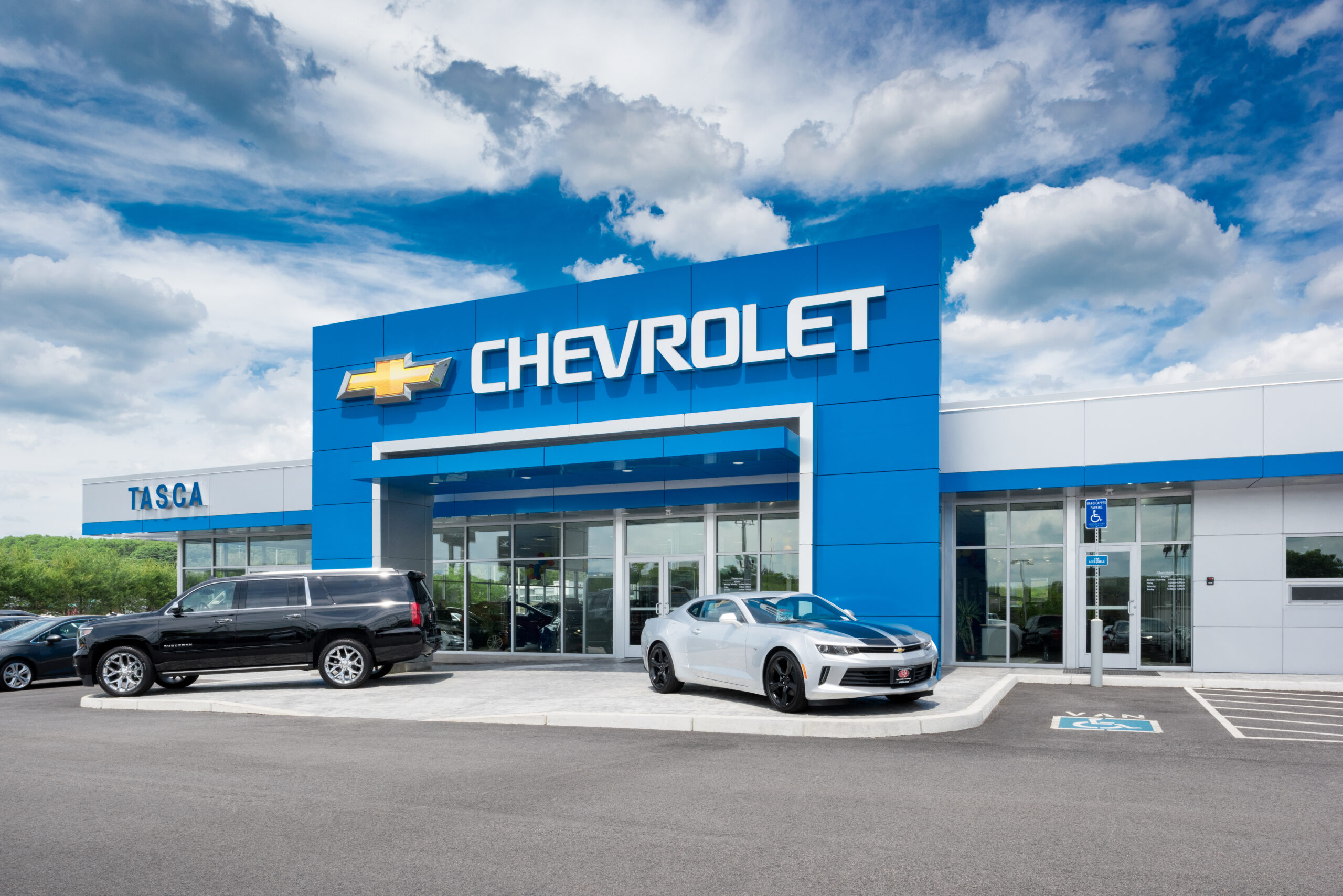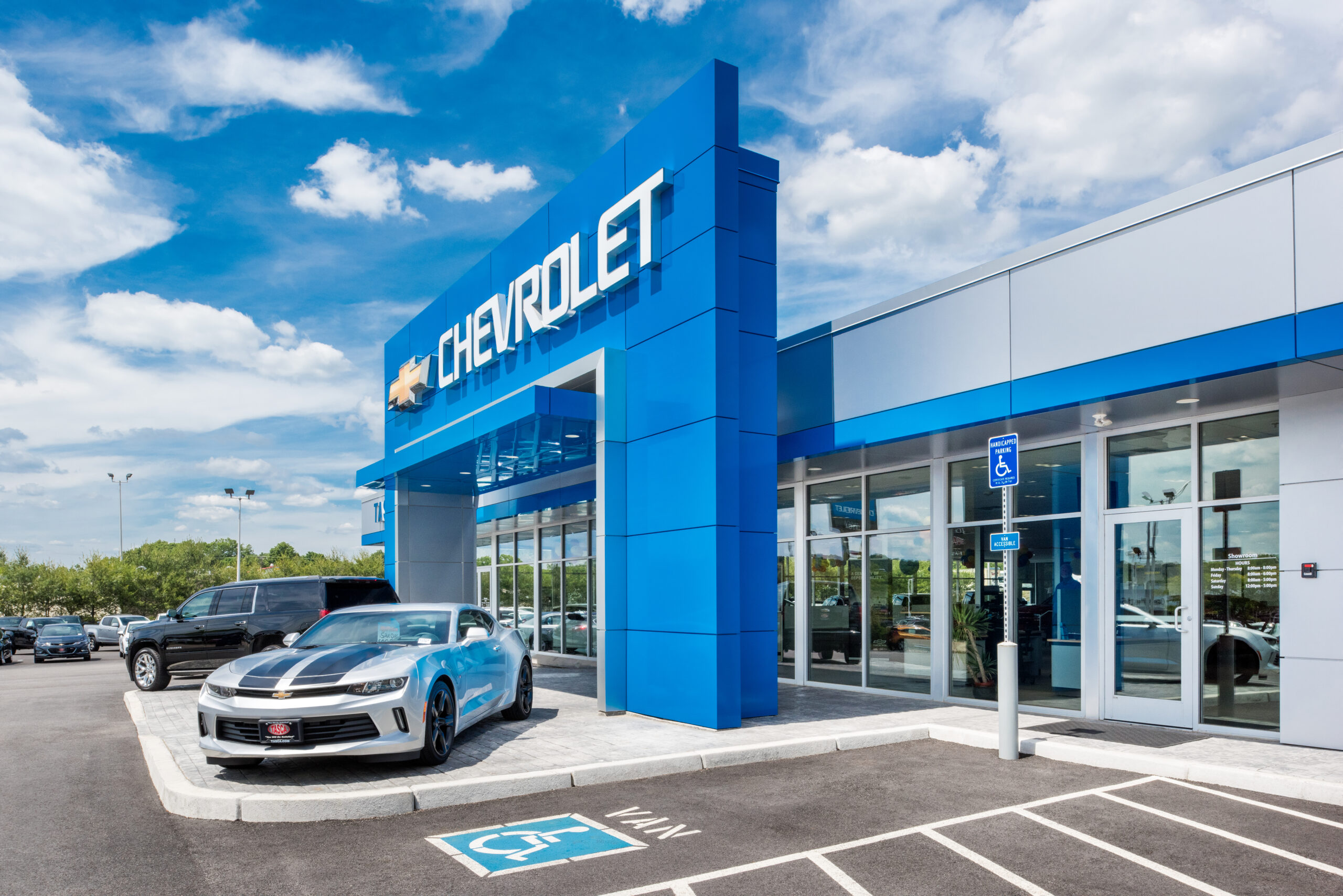 Exterior renovations included a new free standing entry tower, new glass storefront assemblies, new metal panel cladding, and new garage doors in the service drive. Interior renovations included floor plan alterations and finishes to the showroom, lounge, parts, service, restrooms, conference room, and sales office areas.