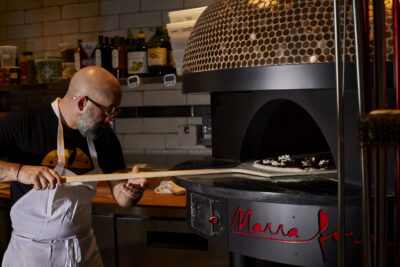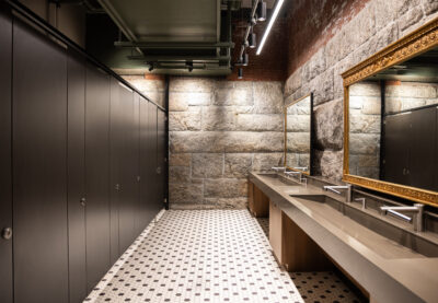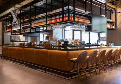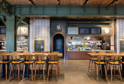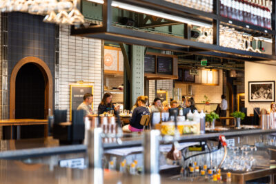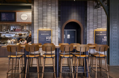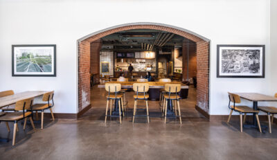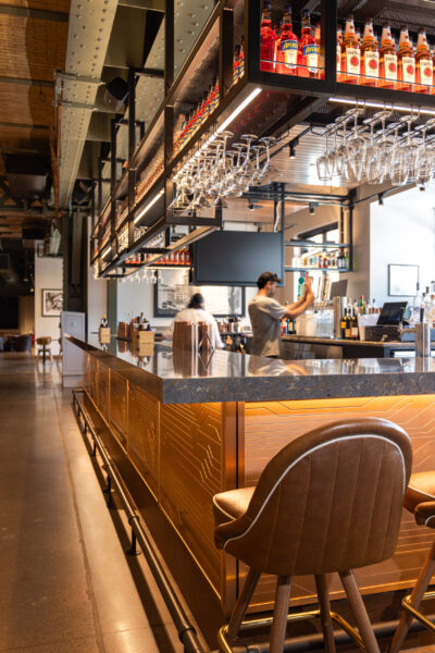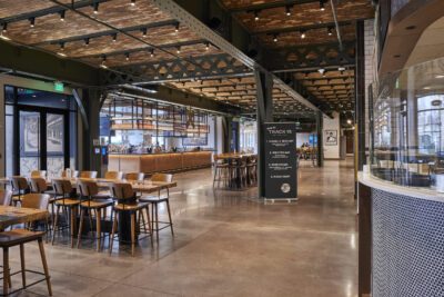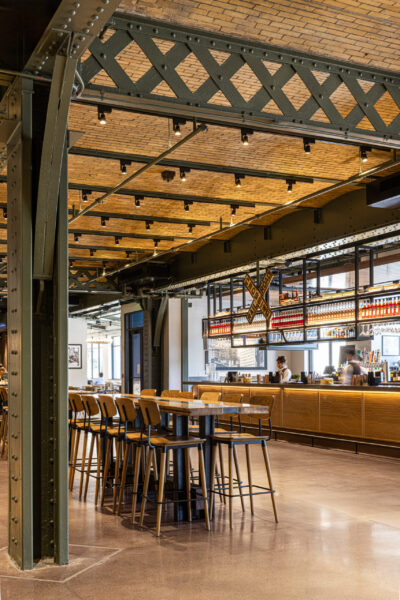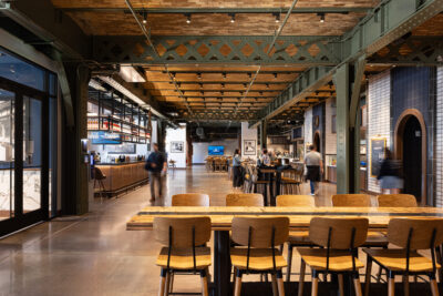 Conceived around the concept of flexibility and connection, the expansive 18,000 SF space features a central bar, communal seating, and seven diverse food vendors. Our design approach was to celebrate the building’s industrial character, choosing to retain as much of the original structure and turn of the 20th century features as possible. With crisp contemporary finishes and carefully selected lighting – in contrast to the buildings original brick and granite foundation walls – the space feels intimate and curated, despite its scale.