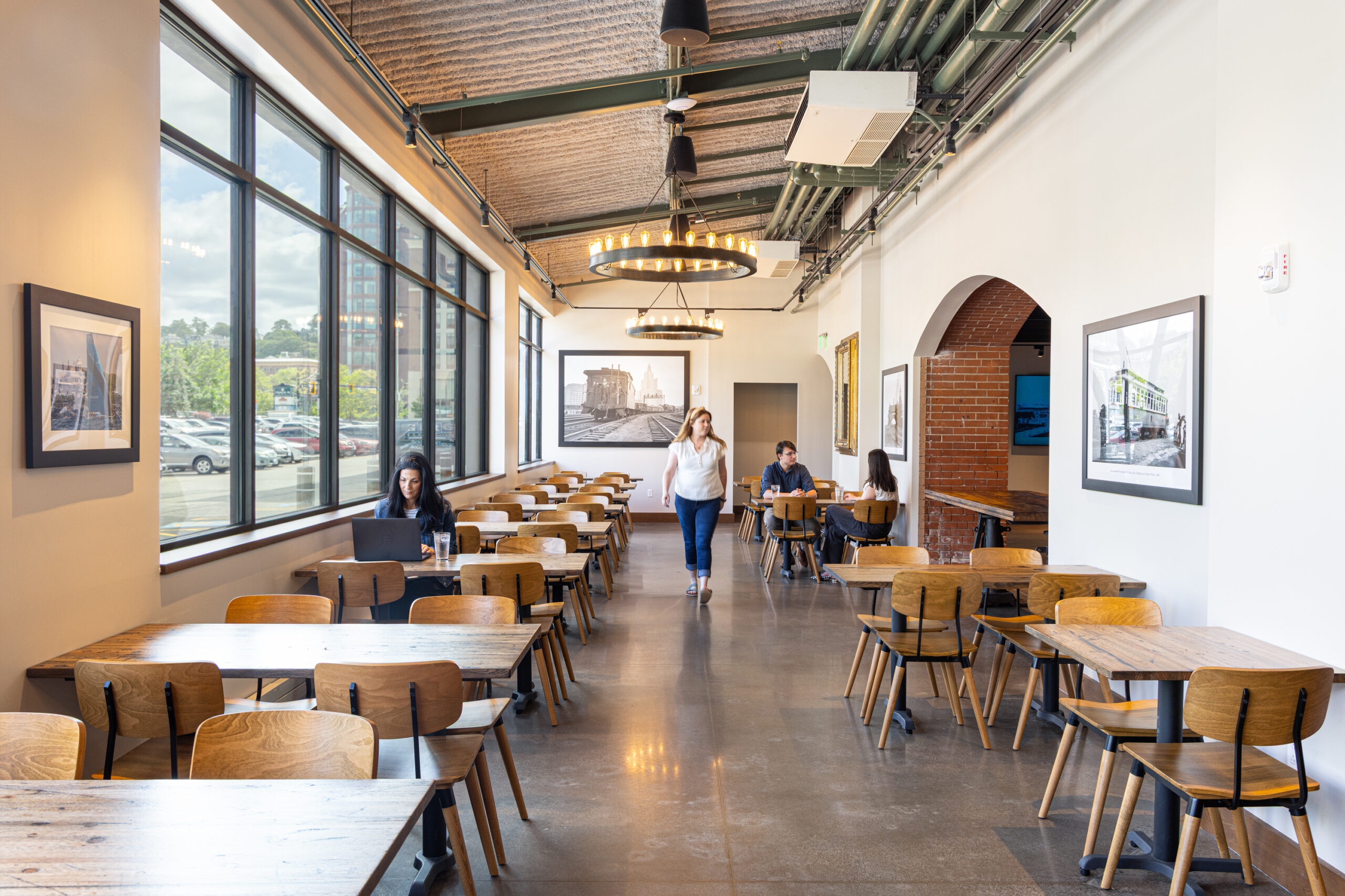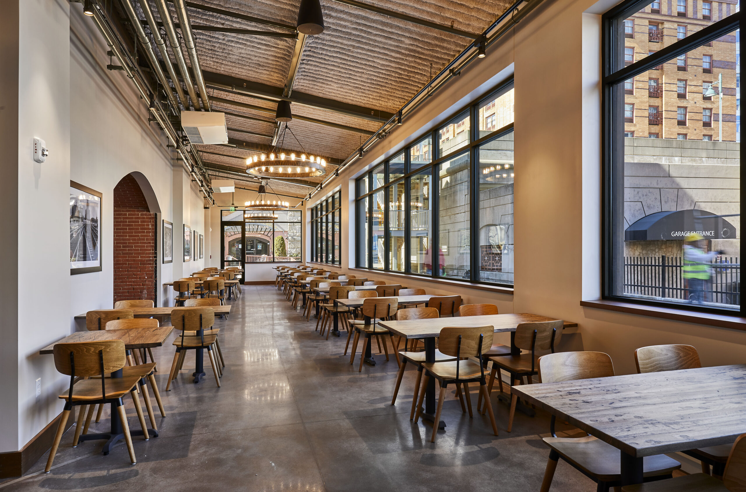 Conceived around the concept of flexibility and connection, the expansive 18,000 SF space features a central bar, communal seating, and seven diverse food vendors. Our design approach was to celebrate the building’s industrial character, choosing to retain as much of the original structure and turn of the 20th century features as possible. With crisp contemporary finishes and carefully selected lighting – in contrast to the buildings original brick and granite foundation walls – the space feels intimate and curated, despite its scale.