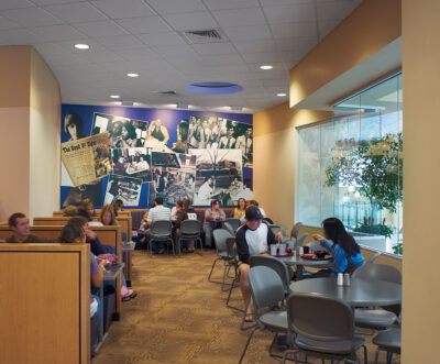 Dining Services at the University of Rhode Island is committed to meeting and exceeding student expectations. After Vision 3 Architects conducted a study of current and future dining facility needs at the Kingston Campus, Dining Services concluded that a new facility to replace the current Hope and Roger Williams Dining Halls would be needed.Vision 3 Architects was commissioned to design a facility that would operate more efficiently and incorporate sustainable design principles; provide students, faculty, staff and visitors convenience as-well as upscale dining options in a retail like setting; and, enhance a sense of community in the surrounding residential life district.