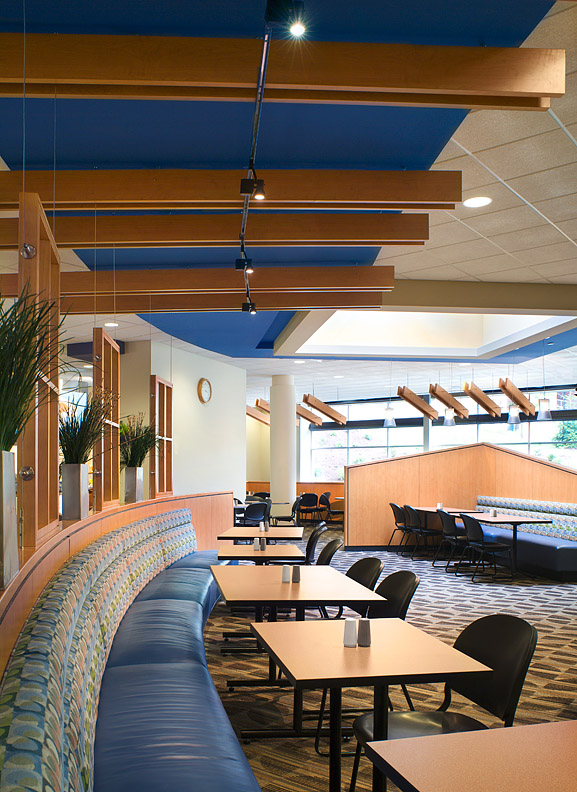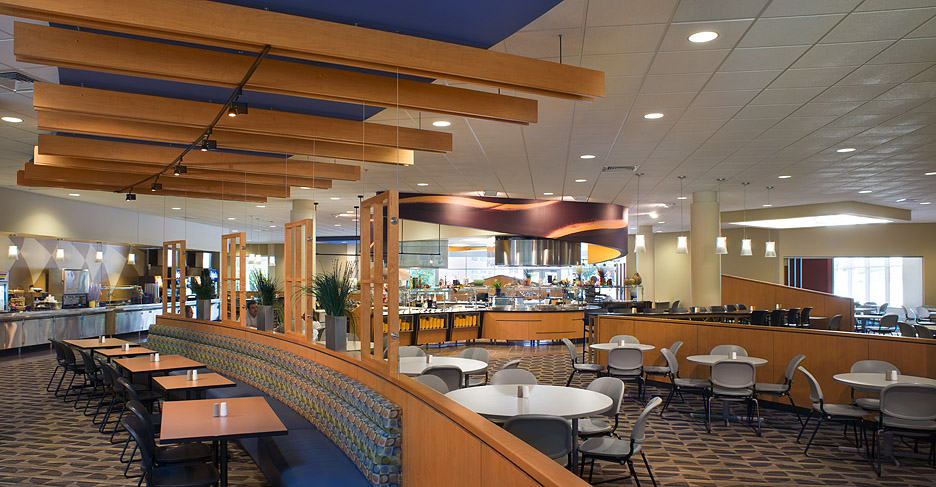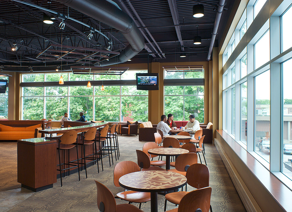 Dining Services at the University of Rhode Island is committed to meeting and exceeding student expectations. After Vision 3 Architects conducted a study of current and future dining facility needs at the Kingston Campus, Dining Services concluded that a new facility to replace the current Hope and Roger Williams Dining Halls would be needed.Vision 3 Architects was commissioned to design a facility that would operate more efficiently and incorporate sustainable design principles; provide students, faculty, staff and visitors convenience as-well as upscale dining options in a retail like setting; and, enhance a sense of community in the surrounding residential life district.